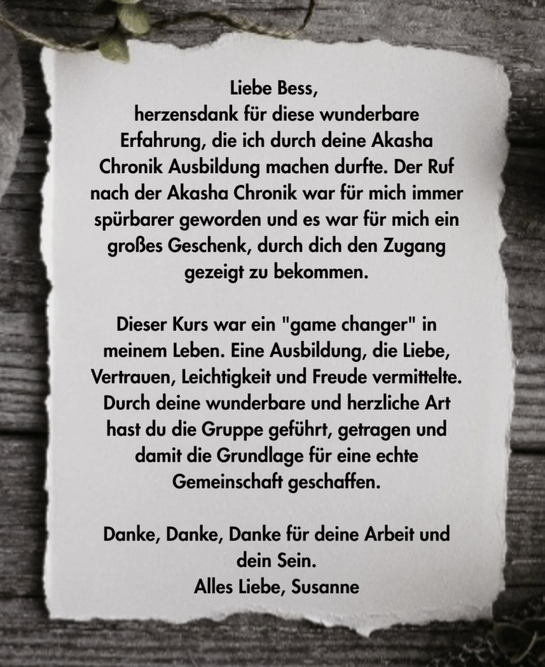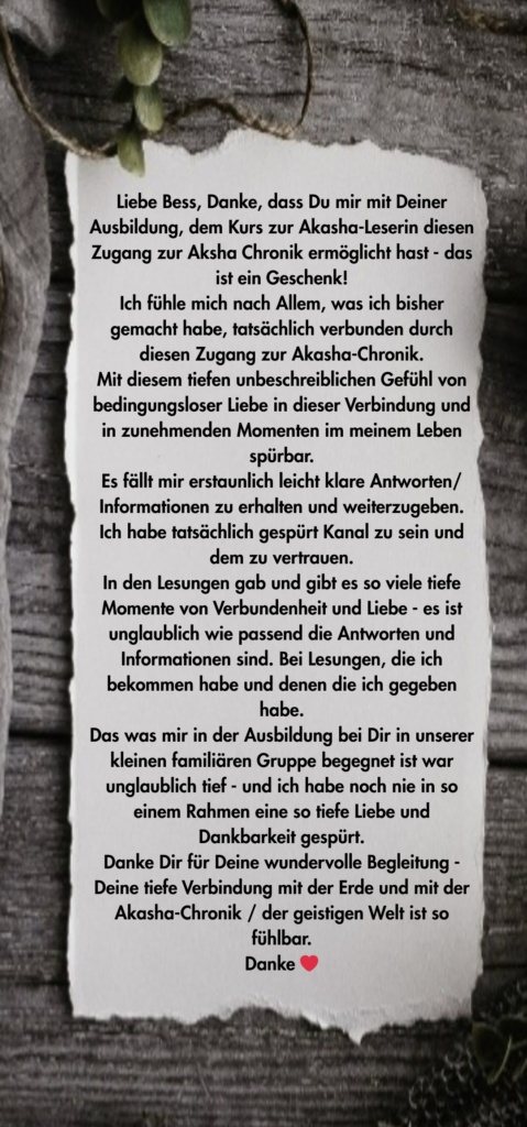 In der Ausbildung zum Akasha Chronik Medium lernst Du, Dich mit der Akasha Chronik zu verbinden und erfährst, wie Du die Weisheit und Liebe der Akasha Chronik nicht nur für Dich selbst, sondern auch für andere Menschen zugänglich machst und professionelle Akasha Chronik Beratungen geben kannst.